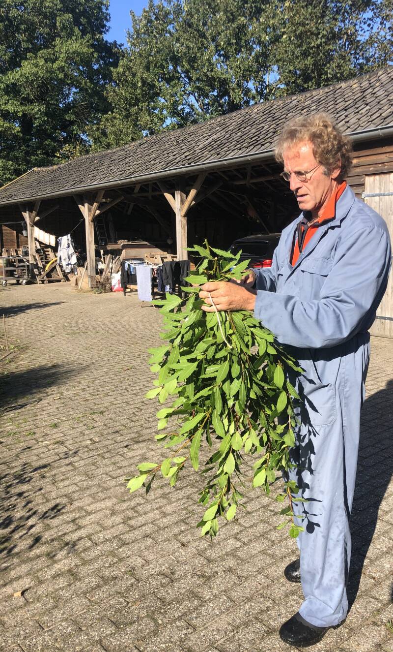 Nog net voor de regen met bakken uit de hemel komt, hebben we de laurierstruik gesnoeid. Ik maak het mijzelf gemakkelijk en heb manlief gevraagd om de takken bijeen te binden. De laurierblaadjes hang ik binnen op en dan drogen ze vanzelf. Je krijgt dan niet van die mooie platte laurierblaadjes die je in een zakje koopt, want ze krullen wat op. Maar ik gebruik de laurierblaadjes voor de soep of stoofpotten en dan maakt het helemaal niet uit dat ze niet "plat" zijn. Als ze gedroogd zijn, gaan ze in potten of geef ik ze weg.