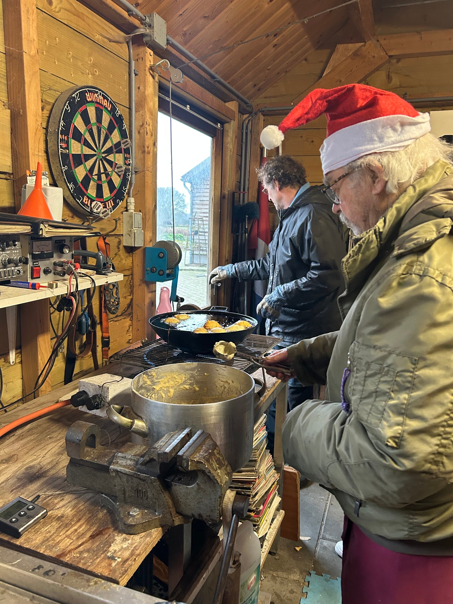 Ieder jaar bakte mijn vader oliebollen en ik deed de hand- en spandiensten. Dit jaar moest ik het met Jan uitvinden hoe het ook al weer ging, dat oliebollenbakken. Mijn vader deed de morele ondersteuning en riep zo nu en dan een goed advies. Op de foto mijn oliebollen en op de andere foto zoals het vorig jaar ging. Als je erbij staat en de oliebollen worden gebakken, lijkt het simpel, maar ik had nog de grootste moeite met het op temperatuur houden van de olie. En ik maakte ook de klassieke fout door de rozijnen nattig in het deeg te roeren. Ach ja, voor een eerste keer, ging het best goed. De 50 oliebollen en 30 appelflappen werden met smaak verorberd.
