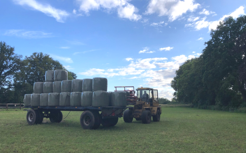 Tussen de regenbuien door is het de buurman toch gelukt om te hooien. Bij ons staat het nog op het land. We hebben de wintervoorraad weer aangevuld met 40 balen hooi. De paarden kunnen weer even vooruit.