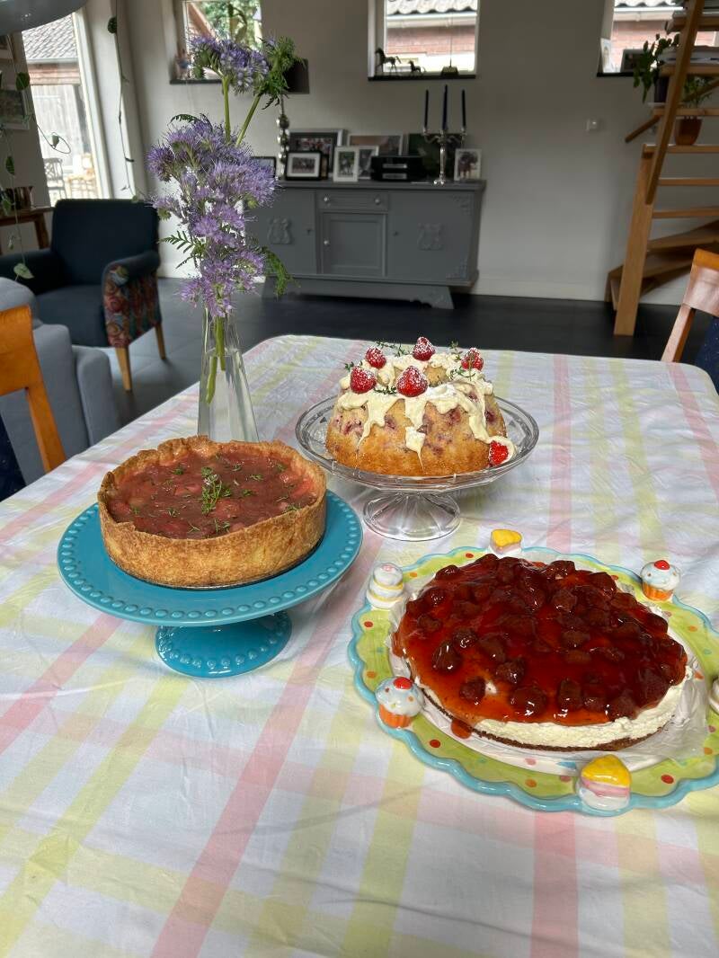 De rabarber kan worden geoogst en er was wat te vieren, dus ik bedacht dat er iets met rabarber gebakken moest worden. Er lag nog een sinaasappel en de combinatie met rabarber is echt heerlijk! Al eens geprobeerd? Rabarber in stukjes snijden, suiker erbij en een uitgeperste sinaasappel erbij en even koken totdat de rabarber uit elkaar valt. Af laten koelen en echt heerlijk van smaak. Maar goed, terug naar de taart. Het belang van goede spullen is zo klaar als een klontje, want mijn oven doet het niet goed. Je zet de oven op 175 graden en hij gaat spontaan naar 200 graden. Het is niet te doen. Bakken met hindernissen dus. Ik vind het nog een prestatie dat dit uit de oven is gekomen. Het recept moet nog wat beter worden en dan hoop ik dat het goed komt. Het wordt nu toch echt tijd voor een nieuwe oven.