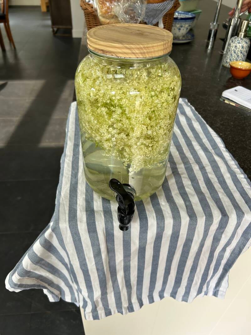 Warm weer betekent veel water drinken. Ik zet dan zo'n watercontainer vol met ijsklontjes en lekkere sinaasappelschijfjes met citroenmelisse of munt uit de tuin klaar. En tappen maar.