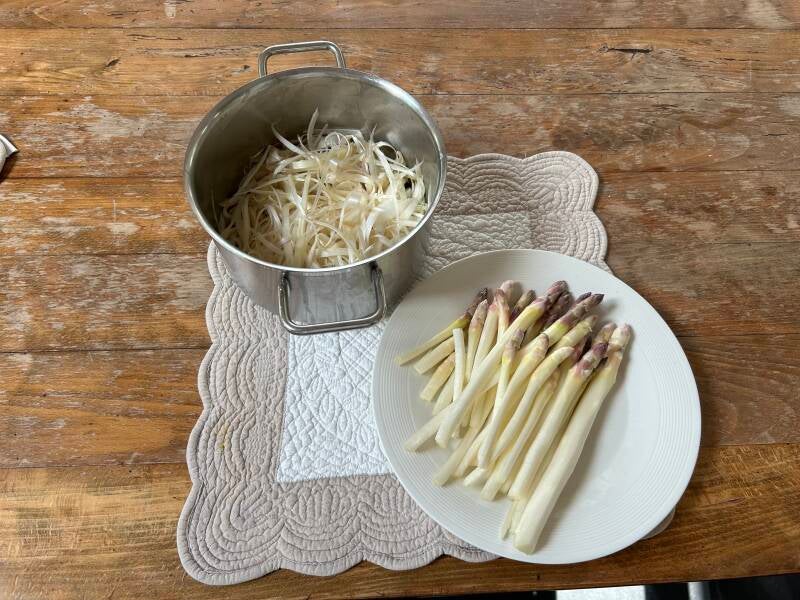 Het is volop aspergetijd en als wij asperges eten wordt er altijd van de schillen een aspergesoep gemaakt.